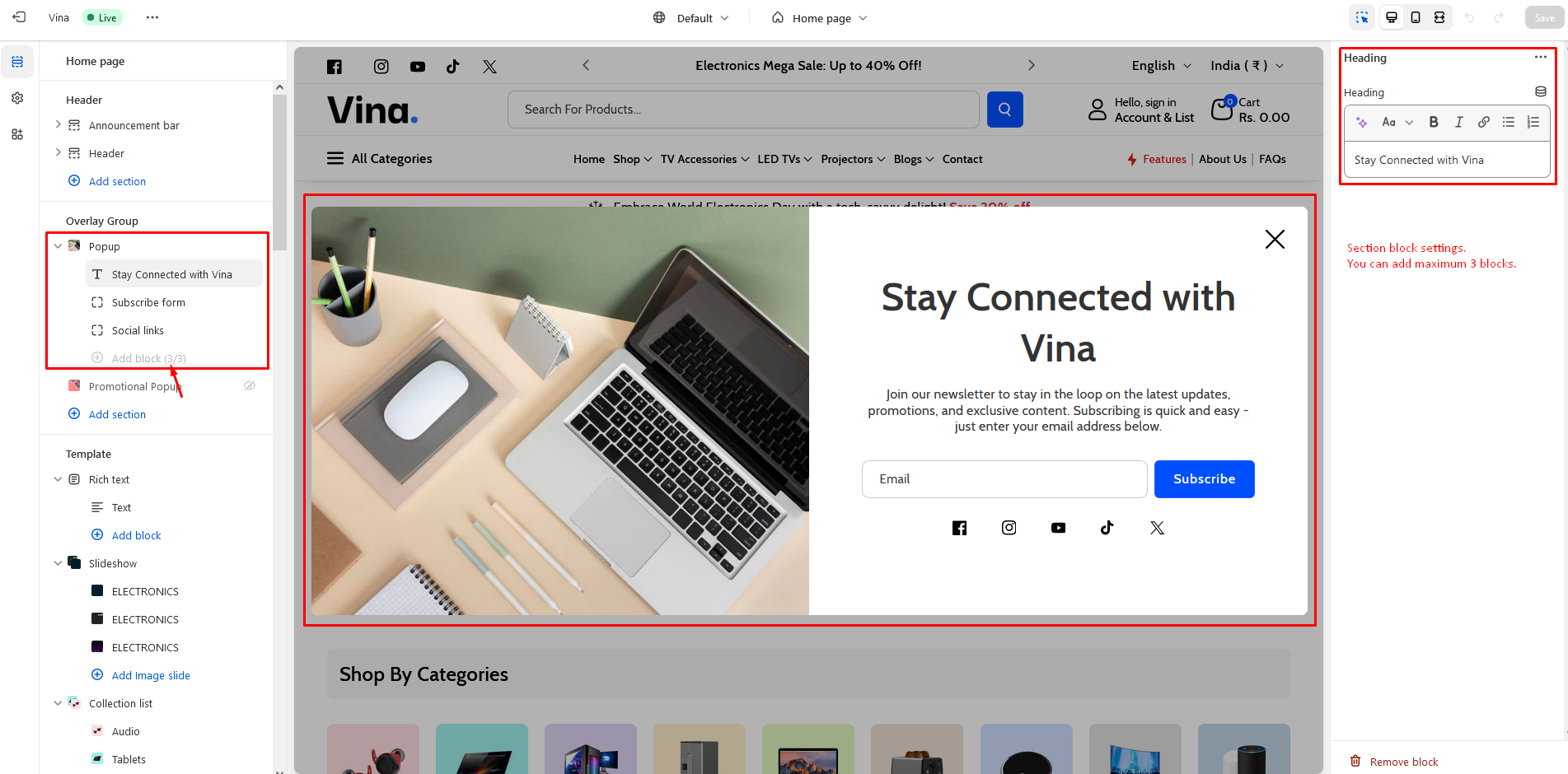 To add block to the Popup section, click on the 'Add block'. There are many options available , as you can see in the below points and screenshot.