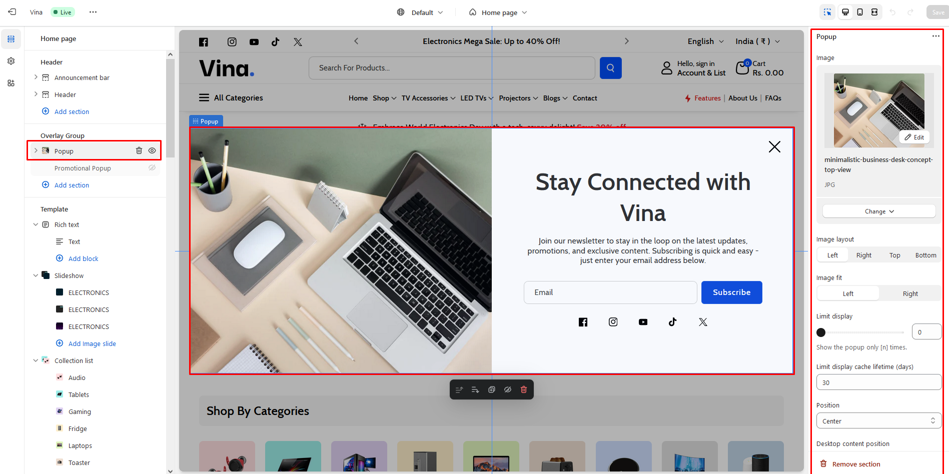 To change the position of the content on the popup, utilize the "Desktop content position" setting. Customization of the "Desktop content position" in the popup section is as follows: