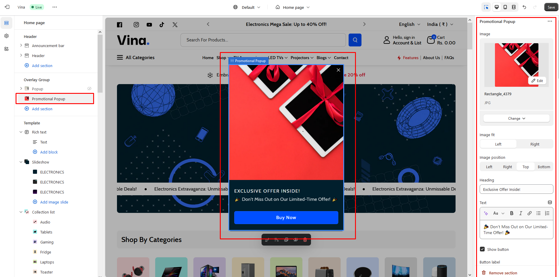 To change the position of the promotional popup, utilize the "Position" setting. Customization of the "Position" in the promotional popup section is as follows: