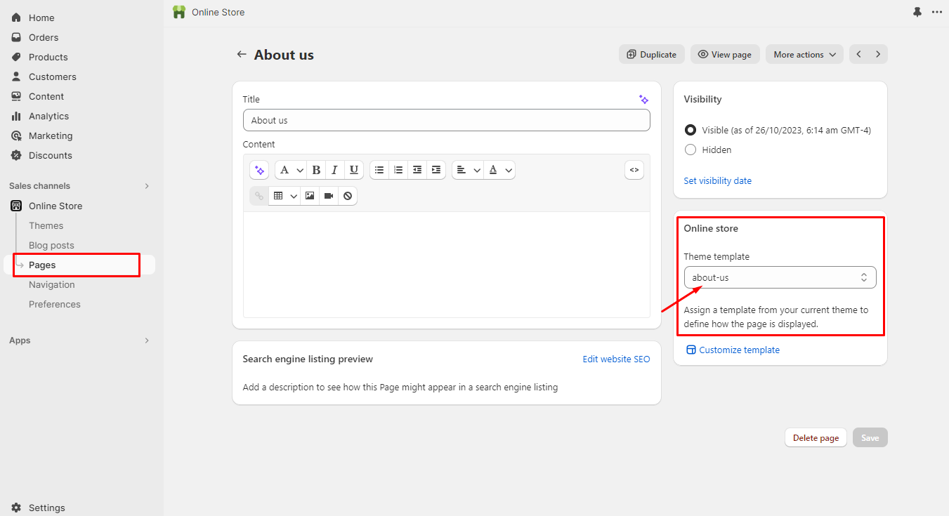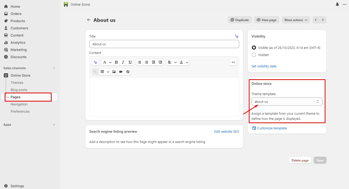 To add an About us or our store Page, Select Aboutus in the Theme Template dropdown.