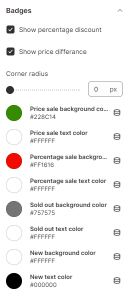 Use this setting to customize the "**Badges**" Show percentage discount, Show price differance, Corner radius and Badges color scheme.